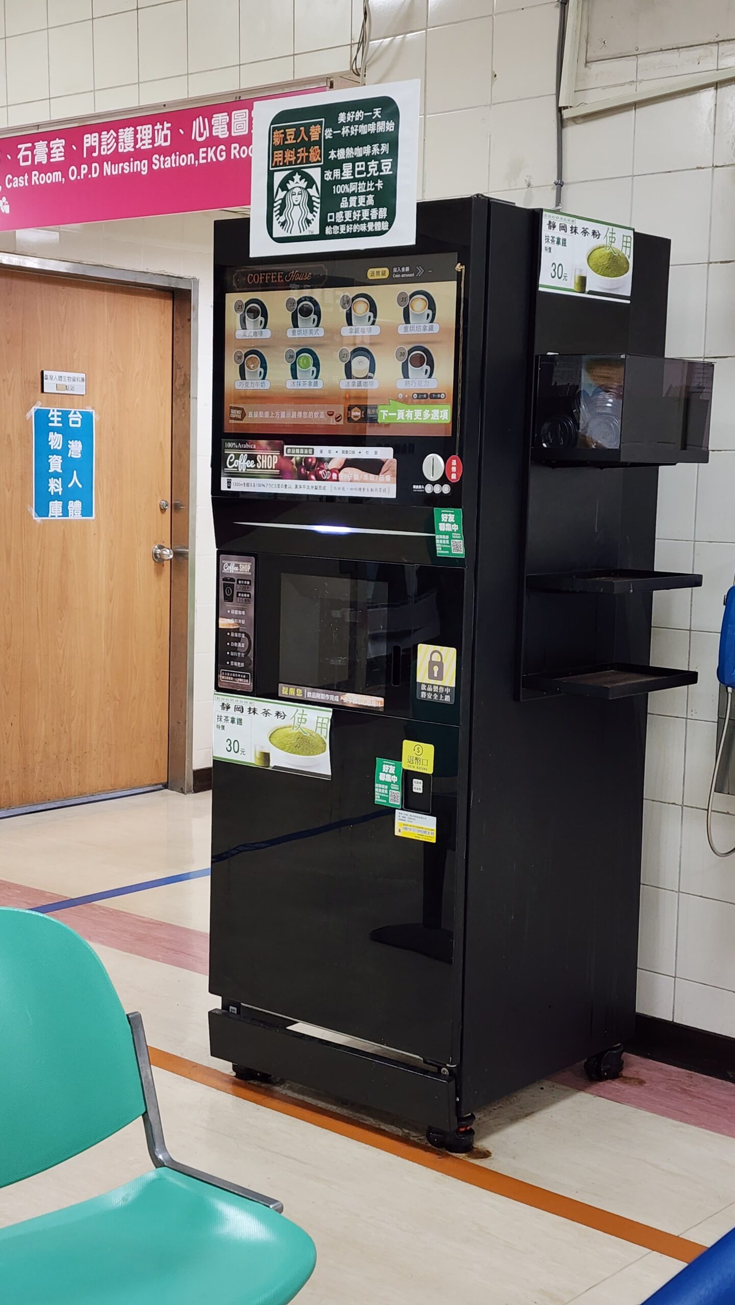 後來要離開醫院之前(汀州三總),在一樓櫃檯處附近發現了這台有趣的機器,居然在賣現煮的咖啡奶茶等飲料,而且還是選用星巴克的豆子。