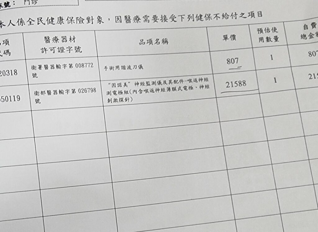 其中,手術的自費項目不算少,但三總開列出來的價目算是相對比較親民了……